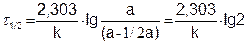 - ln(а – х) = kt + const, (5.11) где const – постоянная интегрирования, которая определяется из условия, что в начале опыта t = 0 и x = 0. Подставив эти значения в уравнение (5.11), найдем: const = - ln a. Подставляя эту величину в уравнение (5.11), получим: - ln(а – х) = kt - lnа, (5.12)