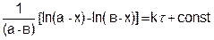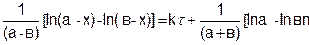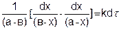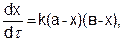 где k – константа скорости, a и b – число молей веществ А и В в начальный момент времени, х – число прореагировавших молей. Здесь возможны два случая. Первый случай, когда вещества а и b вступают в реакцию в эквивалентных количествах (a = в) и второй, когда (a ≠ в). Рассмотрим оба случая. Первый случай (a = в). Уравнение (5.15) принимает вид