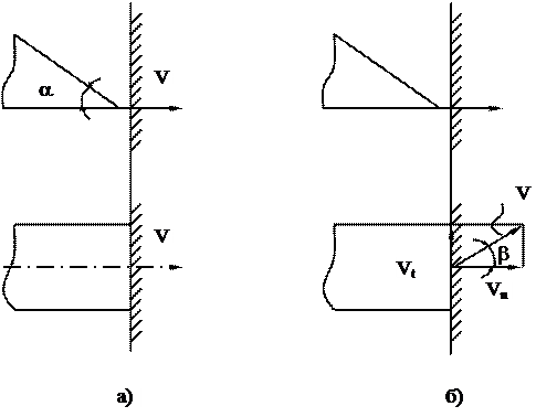 Рис. 8.2. Основные способы резания: а) схема движения ножа перпендикулярно режущей кромке (рубка продукта) б) схема движения ножа под углом к режущей кромке (резка продукта) При резке продуктов результирующая скорость движения ножа определяется