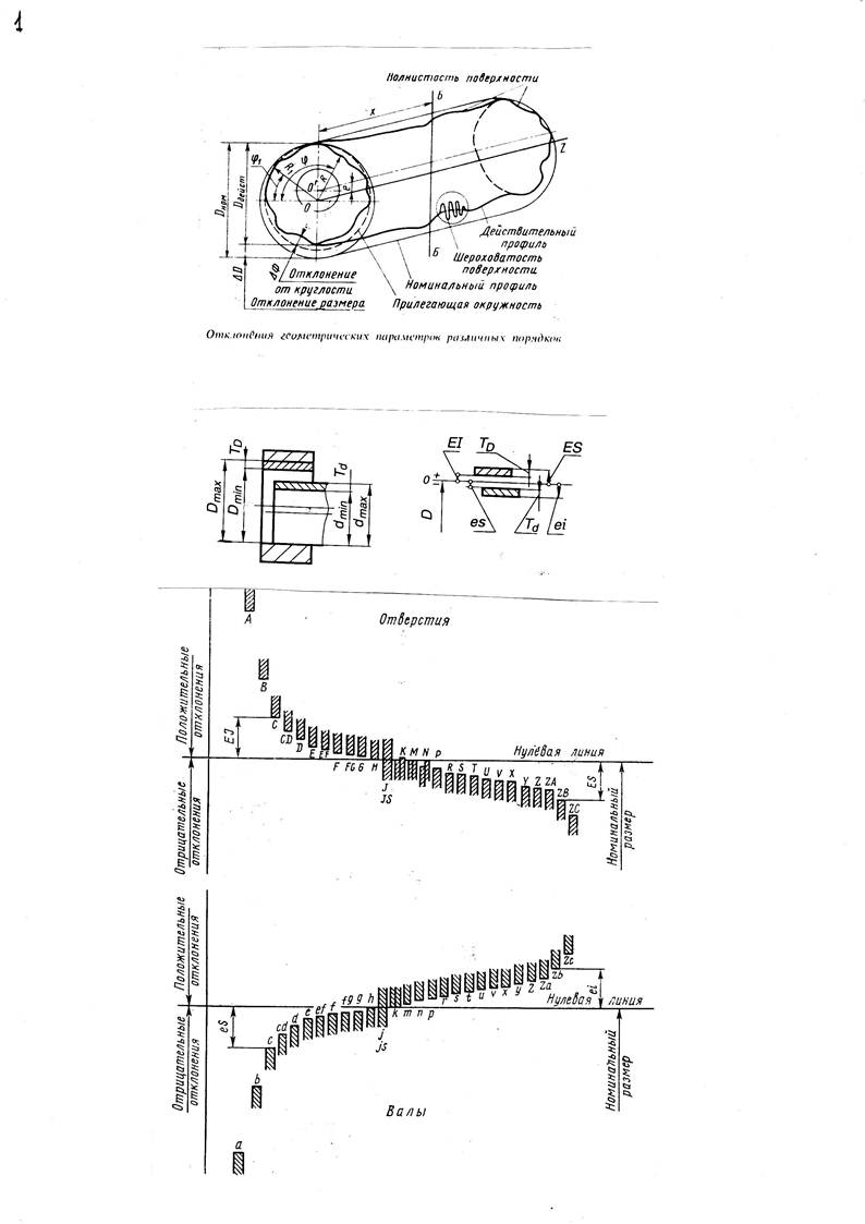 Различают номинальное и действительные, реальные поверхности (профили). Они различаются из-за погрешностей изготовления и изменений в процессе эксплуатации. Выявление причин погрешностей, часто имеющих периодический характер, позволяет разделить вызываемые ими отклонения, с целью поиска путей их уменьшения, на 5 групп (порядков). В общем случае нормируются отклонения порядков: 0-го – собственно размера; 1-го – расположения; 2-го – формы; 3-го – имеющие характер волнистости и 4-го – имеющие характер шероховатости. Геометрические параметры оценивают количественно с помощью размеров или между поверхностям между поверхностью и базой. База это поверхность (сочетание поверхностей), ось, точка, принадлежащая изделию и используемая для базирования при нахождении размера или отклонения. При этом используют термин «вал» не только для охватываемых цилиндрических, но и плоских поверхностей, а термин «отверстие» - для таких же охватывающих поверхностей. Размеры валов обозначают строчными буквами, а отверстии – прописными.