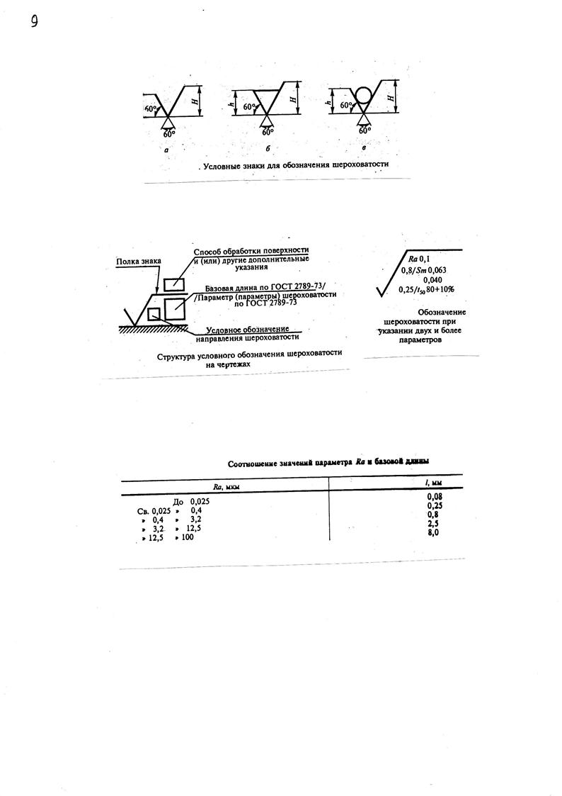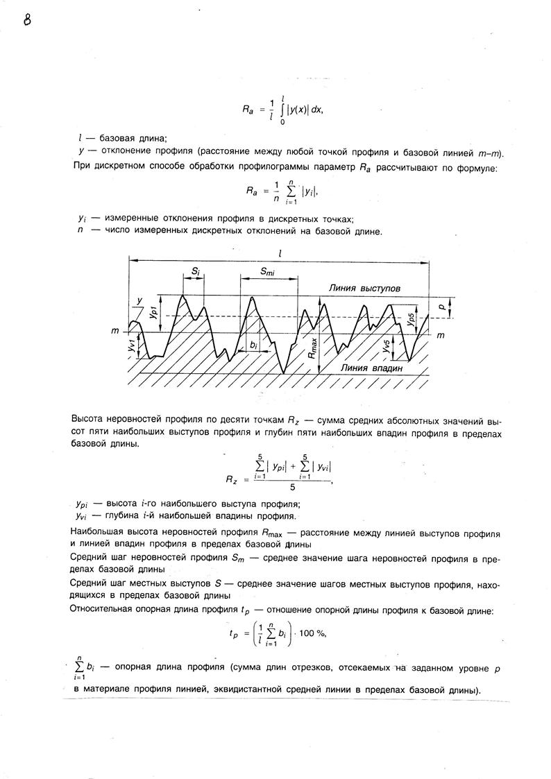 Неровности на поверхностях деталей в основном являются следствием технологических погрешностей. Во многих случаях выступы и впадины на поверхностях периодически повторяются. Выявлению причин этих погрешностей способствует анализ колебательных процессов в системе «станок – приспособление – инструмент – деталь». По результатам этого анализа и выявленным причинам технологических погрешностей неровности условно разделили на 3 вида по отношению шага к высоте неровностей Числовые значения параметров шероховатости определяют от единой базы, в качестве которой принята средняя линия профиля (система М). Эта линия имеет форму номинального профиля и называется базовой. Для количественного определения параметров шероховатости используется отрезок – базовая длина ℓ. Установлено 5 значений ℓ: 0,08; 0,25; 0,8; 2,5 и 8 мм. Стандарт рекомендует конкретное значение ℓ из этого ряда для определенного диапазона высотных параметров (на основании выявленной для большинства видов механической обработки поверхностей устойчивой связи средних шагов неровностей с их высотами). В зависимости от эксплуатационных требований и размеров оцениваемой поверхности контроль параметров шероховатости можно проводить на нескольких участках ℓ, принимая в качестве результата среднюю величину данного параметра. Стандарт предусматривает следующие 6 параметров для оценки шероховатости поверхности: Параметры шероховатости, которые целесообразно контролировать, и их оптимальные численные значения определяются функциональным назначением данной поверхности. На рабочем чертеже детали шероховатость должна быть указана для всех поверхностей, выполняемых по нему (кроме поверхностей, шероховатость которых не обусловлена требованиями конструкции). Стандартом установлена структура обозначения шероховатости, в которой предусмотрена возможность и форма указания: любого из перечисленных параметров, базовой длины, способа обработки поверхности и направления шероховатости. Установлены также способы нанесения обозначений на чертежах и предпочтительные численные значения параметров шероховатости. Одним из признаков волнистости являются неровности, у которых расстояния между соседними выступами или впадинами превышают базовую длину ℓ. Волнистость оценивают двумя параметрами: высотой волнистости