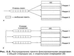 Простейший способ управления оперативной памятью состоит в том, что память разбивается на несколько областей фиксированной величины, называемых разделами. Такое разбиение может быть выполнено вручную оператором во время старта системы или во время ее установки. После этого границы разделов не изменяются. Очередной новый процесс, поступивший на выполнение, помещается либо в общую очередь (рис. 5.8, а), либо в очередь к некоторому разделу (рис, 5.8, б).