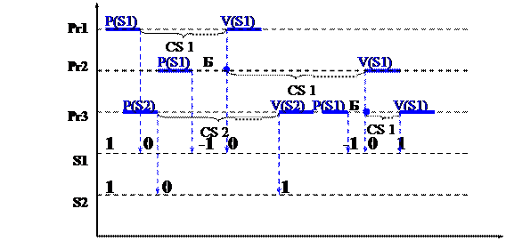 Рис. 6. Временная диаграмма для двоичного семафора (семафоры - S1 и S2) Б – блокировано, СS1 и CS2 – критические участки 1 и 2, идентифицированные семафорами S1 и S2.
