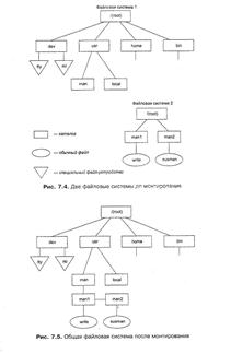 Рассмотрим, как осуществляется эта операция на примере ОС UNIX. Среди всех имеющихся в системе логических дисковых устройств операционная система выделяет одно устройство, называемое системным. Пусть имеются две файловые системы, расположенные на разных логических дисках (рис. 7.4), причем один из дисков является системным. Файловая система, расположенная на системном диске, назначается корневой. Для связи иерархий файлов в корневой файловой системе выбирается некоторый существующий каталог, в данном примере — каталог man. После выполнения монтирования выбранный каталог man становится корневым каталогом второй файловой системы. Через этот каталог монтируемая файловая система подсоединяется как поддерево к общему дереву (рис. 7.5). После монтирования общей файловой системы для пользователя нет логической разницы между корневой и смонтированной файловыми системами, в частности именование файлов производится так же, как если бы она с самого начала была единой. Лекция 2 (2/4)