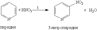 2. Ароматические свойства. Подобно бензолу, пиридин вступает в реакции электрофильного замещения, однако, его активность в этих реакциях ниже, чем бензола, из-за большой электроотрицательности атома азота. Пиридин нитруется при 300 ° С с низким выходом:
