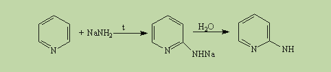 Атом азота в реакциях электрофильного замещения ведет себя как заместитель 2-го рода, поэтому электрофильное замещение происходит в мета- положение. В отличие от бензола пиридин способен вступать в реакции нуклеофильного замещения, поскольку атом азота оттягивает на себя электронную плотность из ароматической системы и орто-пара- положения по отношению к атому азота обеднены электронами. Так, пиридин может реагировать с амидом натрия, образуя смесь орто- и пара- аминопиридинов (реакция Чичибабина):