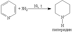 При гидрировании пиридина ароматическая система разрушается и образуется пиперидин, который представляет собой циклический вторичный амин и является гораздо более сильным основанием, чем пиридин: