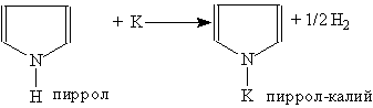 Сильные минеральные кислоты могут вытягивать электронную пару атома азота из ароматической системы, при этом ароматичность нарушается и пиррол превращается в неустойчивое соединение, которое сразу полимеризуется. Неустойчивость пиррола в кислой среде называется ацидофобностью. Пиррол проявляет свойства очень слабой кислоты. Онреагирует с калием, образуя пиррол-калий: