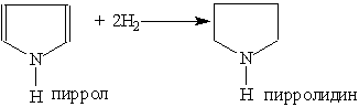 Пиррол, как ароматическое соединение, склонен к реакциям электрофильного замещения, которые протекают преимущественно у a -атома углерода (соседнего с атомом азота). При гидрировании пиррола образуется пирролидин — циклический вторичный амин, проявляющий основные свойства: