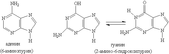 Ароматическая система пурина включает десять p -электронов (восемь электронов двойных связей и два электрона пиррольного атома азота). Пурин — амфотерное соединение. Слабые основные свойства пурина связаны с атомами азота шестичленного цикла, а слабые кислотные свойства — с группой NH пятичленного цикла. Основное значение пурина состоит в том, что он является родоначальником класса пуриновых оснований. Пуриновые основания — производные пурина, остатки которых входят в состав нуклеиновых кислот: аденин, гуанин.