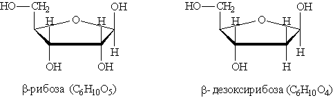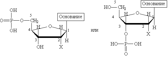 При частичном гидролизе нуклеиновых кислот образуется смесь нуклеотидов, молекулы которых построены из остатков фосфорной кислоты, моносахарида (рибозы или дезоксирибозы) и азотистого основания (пуринового или пиримидинового). Остаток фосфорной кислоты связан с 3-м или 5-м атомом углерода моносахарида, а остаток основания — с первым атомом углерода моносахарида. Общие формулы нуклеотидов: