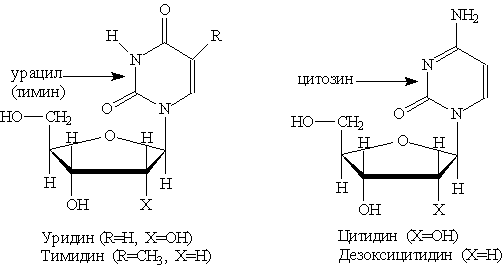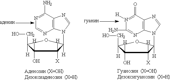 где Х=ОН для рибонуклеотидов, построенных на основе рибозы, и Х==Н для дезоксирибонуклеотидов, построенных на основе дезоксирибозы. В зависимости от типа азотистого основания различают пуриновые и пиримидиновые нуклеотиды. Нуклеотид — основная структурная единица нуклеиновых кислот, их мономерное звено. Нуклеиновые кислоты, состоящие из рибонуклеотидов, называют рибонуклеиновыми кислотами (РНК). Нуклеиновые кислоты, состоящие из дезоксирибонуклеотидов, называют дезоксирибонуклеиновыми кислотами (ДНК). В состав молекул РНК входят нуклеотиды, содержащие основания аденин, гуанин, цитозин и урацил. В состав молекул ДНК входят нуклеотиды, содержащие аденин, гуанин, цитозин и тимин. Для обозначения оснований используют однобуквенные сокращения: аденин — А, гуанин — G, тимин — Т, цитозин —С, урацил — U. Свойства ДНК и РНК определяются последовательностью оснований в полинуклеотидной цепи и пространственным строением цепи. Последовательность оснований содержит генетическую информацию, а остатки моносахаридов и фосфорной кислоты играют структурную роль (носители, оснований). При частичном гидролизе нуклеотидов отщепляется остаток фосфорной кислоты и образуются нуклеозиды, молекулы которых состоят из остатка пуринового или пиримидинового основания, связанного с остатком моносахарида — рибозы или дезоксирибозы. Структурные формулы основных пуриновых и пиримидиновых нуклеозидов: Пуриновые нуклеозиды: