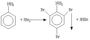 Важнейшие представители аминов. Простейшие алифатические амины — метиламин, диметиламин, диэтиламин — находят применение при синтезе лекарственных веществ и других продуктов органического синтеза. Гексаметилендиамин NH2—(СН2)2—NH6 является одним из исходных веществ для получения важного полимерного материала нейлона. Анилин C6H5NH2 — важнейший из ароматических аминов. Он представляет собой бесцветную маслянистую жидкость, мало растворимую в воде. Для качественного обнаружения анилина используют его реакцию с бромной водой, в результате которой выпадает белый осадок 2,4,6-триброманилина: