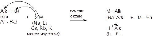 3. Реакция присоединения щелочных металлов к углеводородам с сопряжёнными p-связями, в том числе и к ароматическим Механизм присоединения заключается в том, что углеводород принимает электрон щелочного металла (на низшую из незанятых орбиталей) и образуется ионная пара).