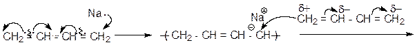 - получение бутадиенового каучука в присутствии металлического натрия: Следующая молекула присоединяется к металлорганическому соединению. Натрийбутадиеновый каучук образуется как путём 1,4-, так и путём 1,2-присоединения, т.е. имеет нерегулярный характер. Такой метод получения называется ионной, а именно анионной полимеризацией – реакцией образования полимера путём присоединения молекул мономера к отрицательно заряженному активному центру. В результате каждого акта присоединения растущая частица сохраняет отрицательный заряд. В целом система не несёт заряда, поскольку он компенсируется наличием электроположительных противоионов.