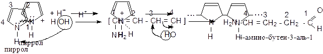 б) Пиррол более устойчив к действию концентрированных кислот, но тоже осмоляется и полимеризуется: