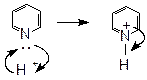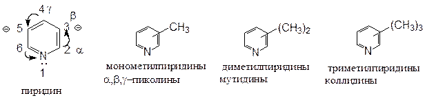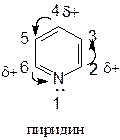 Однако специфические свойства азота отличают химическое поведение пиридина от бензола. У атома азота остаётся незадействованной в сопряжённой системе пара электронов. Электроотрицательность азота больше электроотрицательности углерода, поэтому электронная плотность максимальная на атоме азота, перераспределяется по ядру, что снижает электронную плотность во всём ядре. Минимальная электронная плотность в положениях 1,4,6, т.е. молекула пиридина полярна (не имея заместителей в отличие от бензола). Казалось бы, свободная пара электронов у атома азота должна обусловливать сильную основность пиридина. Однако опыт показал, что пиридин является очень слабым основанием (pKb» 9), чем ароматические амины (pKb» 4), но более сильное, чем пиррол (pKb» 14).