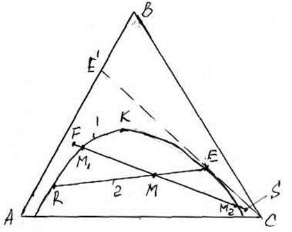 Рис. 285. Изображение однократной экстракции на треугольной диаграмме. 1 - бинодальная кривая, К- критическая точка, 2 - коннода /хорда равновесия/.