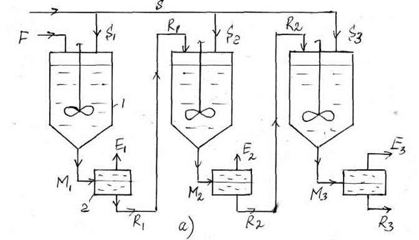 Рис. 286. Схема установки а/ и треугольная диаграмма б/ для многократной экстракции. 1 - экстрактор, 2 - отстойник /сепаратор/.