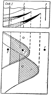 Литологически ограниченные залежи, как правило, небольших размеров. Они встречаются в самых разнообразных структурных условиях: на антиклиналях, моноклиналях и на бортах синклиналей. Не наблюдается закономерности и в отношении заполнения их газом, нефтью и водой. Распределение нефти, воды и газа зависит от относительного положения отдельных залежей на структуре. Как правило, газ, нефть и вода в пределах ловушки располагаются согласно удельным весам. По форме литологические ловушки могут быть в виде линз заливообразной формы (рис. 6) или «шнурков» (шустринги), приуроченных к погребенным береговым валам или «рукавообразным» песчаным пластам, образовавшимся на месте погребенных протоков.