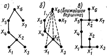 На этапе 1 необходимо решить, в какой последовательности следует соединять контакты одной цепи (т. е. установить перечень проводников одной цепи для каждой пары контактов), чтобы суммарная длина всех соединений цепи была минимальна. Эта задача сводится к задаче построения минимального связывающего дерева. Пусть Х — множество точек на плоскости, соответствующих контактам одной электрической цепи. Рассмотрим полный граф G = = (X, А), в котором множество ребер с приписанным им весом dij характеризуют все возможные соединения электрической цепи между парами контактов. Граф G определяется матрицей расстояний D = [ dij ] nxn, где п — число контактов цепи (n > 3). Необходимо определить в графе G дерево G', включающее все его вершины и имеющее минимальный суммарный вес ребер. Число ребер графа G' равно n — 1. На рис.14, а приведен пример минимального связывающего дерева для семи контактов.