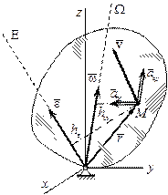 Рис. 1. 7. Скорость и ускорение точки при сферическом движении твердого тела Перемещаясь в пространстве и внутри тела, Мгновенная ось опишет собой конические поверхности, которые называются соответственно неподвижным и подвижным аксоидами. Для получения уравнений этих поверхностей необходимо из уравнений мгновенной оси вращения исключить время. Подвижный аксоид катится без проскальзывания по неподвижному. Данный вывод следует из равенства нулю скоростей точек мгновенной оси вращения, которая является в текущий момент общей для неподвижного и подвижного аксоидов.