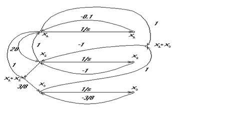 Данная форма представления более характерна пакетам программ, предполагающим значительные преобразования модели, например трансляцию модели в функцию языка программирования и присоединение ее к расчетной части при построении расчетной задачи. Это снимает почти все ограничения на сложность модели, которая по сути дела программируется. В форме СНДУ можно представлять более широкий класс моделей чем в НФК. Недостатком данной формы представления является, так же как и в случае НФК, отсутствие полной информации о структуре модели, что затрудняет решение многих задач топологического характера. Решение этой проблемы возможно при упорядочивании порядка следования уравнений, так что в i- ом уравнении переменная xi являлась следствием. Такой подход встречается в ряде работ, например первые версии пакета NOCSYD [А2, А3]. Использование теории графов для описания моделей систем управления со сложной структурой, стало распространенным в последнее время. Теоретико-графовая форма описания модели позволяет эффективно использовать новые возможности языков программирования, такие как указатели, списки, классы, множественное наследие. Представление в форме ориентированного (сигнального) графа, в частности структурной схемы, расширяет информацию о модели, по сравнению с НФК и СНДУ, позволяя вводить причинно-следственные отношения. Знание о направленности связей имеет большое значение для задач анализа и синтеза. В качестве иллюстрации на рис. 1.1. приведена диаграмма графа модели странного аттрактора Лоренца [93]. Эта форма представления позволяет эффективнее решать задачи выделения путей и контуров, связности, структурной управляемости и многие другие, чем в форме НФК и отчасти СНДУ. Модель системы представляется ориентированным графом H=<G,H> с множеством переменных Х=x1,...., xn, N - общее множество вершин, и множеством дуг G - упорядоченных пар номеров смежных вершин (i,j), G=(i,j)1,... (i,j)n. Общее количество таких пар обозначено в примерах как Q. Несмотря на всю компактность и удобство такой записи, на практике чаще используют матрицу смежности R = rij, показывающую наличие дуги между i-ой и j-ой вершинами.