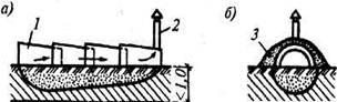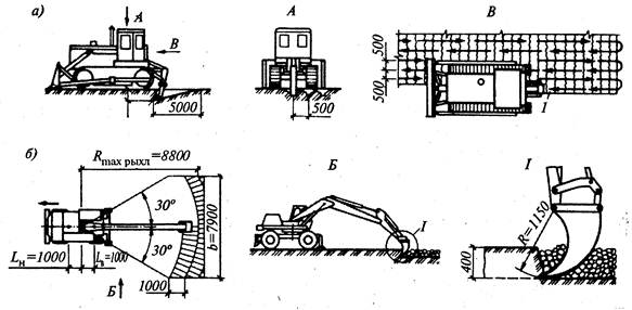 Рис. 3.3. Рыхление мерзлого грунта статическим воздействием: а - бульдозером с активными зубьями; б - экскаватором-рыхлителем; 1 - направление хода рыхления