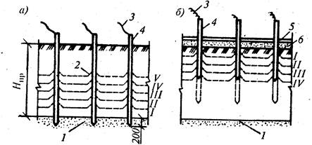 При прогреве сверху вниз предварительно очищают от снега и наледи поверхность, стержни забивают в грунт на 20...25 см, укладывают слой опилок, пропитанных раствором солей. По мере прогрева грунта электроды забивают глубже в грунт. Оптимальной.будет глубина прогрева в пределах 0,7...1,5 м. Продолжительность оттаивания грунта воздействием электрического тока примерно 1,5...2,0 сут, после этого увеличение глубины оттаивания будет происходить за счет аккумулированной теплоты еще в течение 1...2 сут. Расстояние между электродами 40...80 см, расход энергии по сравнению с полосовыми электродами сокращается на 15...20% и составляет 40...75 кВт • ч на 1 м3 грунта. При прогреве снизу вверх пробуривают скважины и вставляют электроды на глубину, превышающую глубину промерзшего грунта на 15...20 см. Ток между электродами идет по талому грунту ниже уровня промерзания, при нагреве грунт отогревает вышележащие слои, которые также включаются в работу. При этом методе применять слой опилок не требуется. Расход энергии составляет 15...40 кВт • ч на 1 м3 грунта. Третий, комбинированный способ, будет иметь место при заглублении электродов в подстилающий талый грунт и устройстве на дневной поверхности опилочной засыпки, пропитанной солевым раствором. Электрическая цепь замкнется наверху и внизу, оттаивание грунта будет происходить сверху вниз и снизу вверх одновременно. Так как трудоемкость подготовительных работ при этом способе самая высокая, то его применение может быть оправдано лишь в исключительных случаях, когда требуется ускоренное оттаивание грунта. Оттаивание токами высокой частоты. Этот метод позволяет резко сократить подготовительные работы, так как промерзший грунт сохраняет проводимость к токам высокой частоты, поэтому отпадает надобность в большом заглублении электродов в грунт и в устройстве опилочной засыпки. Расстояние между электродами может быть увеличено до 1,2 м, т. е. сокращено их количество почти в два раза. Процесс оттаивания грунта протекает относительно быстро. Ограниченное использование способа связано с недостаточным выпуском генераторов токов высокой частоты. Одним из методов, которые в настоящее время утратили свою эффективность и вытеснены более современными, является оттаивание грунта паровыми или водяными иглами. Для этого необходимо наличие источников горячей воды и пара, при малой, до 0,8 м глубине промерзания грунта. Паровые иглы представляют собой металлическую трубу длиной до 2 м и диаметром 25...50 мм. На нижнюю часть трубы насажен наконечник с отверстиями диаметром 2...3 мм. Иглы соединяют с паропроводом гибкими резиновыми шлангами при наличии на них кранов. Иглы заглубляют в скважины, предварительно пробуриваемые на глубину, приблизительно равную 70% глубины оттаивания. Скважины закрывают защитными колпаками, снабженные сальниками для пропуска паровой иглы. Пар подают под давлением 0,06...0,07 МПа. После установки аккумулированных колпаков прогреваемую поверхность покрывают слоем термоизоляционного материала, чаще всего опилок. Иглы располагают в шахматном порядке с расстоянием между центрами 1...1,5 м. Расход пара на 1 м3 грунта составляет 50..100 кг. За счет выделения паром в грунте скрытой теплоты парообразования прогрев грунта проходит особенно интенсивно. Этот метод требует расхода тепловой энергии примерно в 2 раза больше, ч