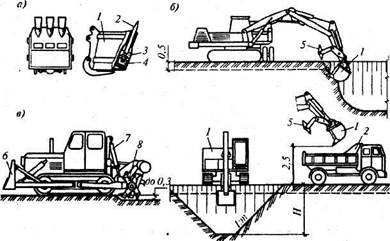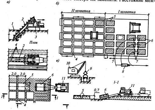 Рис. 3.6. Схема блочной разработки грунта: а- нарезка щелей баровой машиной; б - то же, с извлечением блоков трактором; в - разработка котлована с извлечением блоков мерзлого грунта при помощи крана; 1 - слой мерзлого грунта; 2 - режущие цепи (бары); 3 - экскаватор; 4 - щели в мерзлом грунте; 5 - нарезанные блоки грунта; б - перемещаемые с площадки блоки; 7 - стоянки крана; 8 - транспортное средство; 9 - клещевой захват; 10 - строительный кран; 11 - трактор
