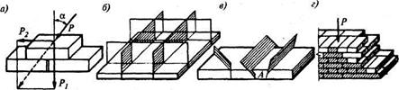 Рис. 11.3. Правила разрезки каменной кладки: а - воздействие на кладку наклонной силы; б - правильное, взаимно-перпендикулярное расположение вертикальных плоскостей разрезки кладки; в - то же, неправильное; г - кладка с правильной перевязкой вертикальных швов