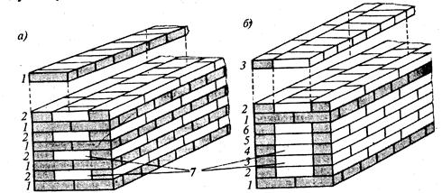 Рис. 11.4. Системы перевязки швов при кладке стен толщиной в два кирпича: а-однорядная (цепная); б - многорядная; 1 - тычковые ряды; 2.6 - ложковые ряды; 7 - забутка