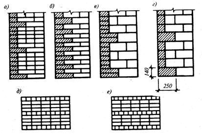 Столбы и простенки следует выкладывать только из целого отборного кирпича. Кладку из кирпича начинают и заканчивают тычковыми рядами. Их располагают в местах опирания балок, прогонов, ферм, плит перекрытий и покрытий, в выступающих рядах кладки - карнизах, поясках, независимо от последовательности кладки рядов принятой системы перевязки. Тычковыми рядами также связывают верстовые ряды с забуткой, поэтому они всегда должны выполняться из целого кирпича. Типы кладки. Кладку стен с облицовкой применяют для придания фасадам лучшего внешнего вида и повышения сопротивляемости наружных поверхностей стен атмосферным воздействиям. Используют лицевой кирпич, плиты керамические и из естественного камня с обязательной перевязкой всей кладки по типу однорядной или многорядной кладки (рис. 11.5) Кладку стен с облицовкой кирпичами и камнями правильной формы применяют для оформления фасадов уникальных зданий и объектов массового строительства, для внутренних стен вестибюлей, лестничных клеток, подземных переходов, для замены трудоемкой штукатурки. Облицовку ведут одновременно с кладкой стен или со сдвигом по времени специальным лицевым кирпичом и керамическими камнями различной обработки и расцветки. Наиболее часто применяют следующие размеры камней и кирпичей: обычного лицевого кирпича -250х120х65 или 88 мм, камней - 250х120х140 мм, трехчетверток -188х120х140 мм. Облицовку стен кирпичом и керамическими камнями одновременно с кирпичной кладкой выполняют путем укладки ее ложковыми рядами и перевязкой с основной кладкой путем укладки тычковых рядов с заделкой кирпичей на V2 длины в монолит основной кладки. Допускают связывание облицовочной кладки с основной с помощью штырей из нержавеющей стали. Применяют различные варианты перевязки облицовочного слоя с кладкой массива стены, но они должны быть обязательно увязаны, и составлять единое целое с основной кладкой, выполняемой по одно- или многорядной системе перевязки. При однорядной системе перевязки облицовку фасадной плоскости производят чередованием ложкового и тычкового рядов. Лицевой кирпич значительно дороже обыкновенного, по этой причине способ оказывается наименее экономичным, так как половина рядов из лицевого кирпича выполняют тычковыми. При возведении стен по многорядной системе перевязки с фасадной стороны пять ложковых рядов перекрывают одним тычковым. Дорогой лицевой кирпич используют более рационально. Облицовку стен из керамических камней выполняют заведением в массив двух тычковых рядов через пять ложковых, а при использовании облицовочных камней - тычковый ряд чередуют тремя ложковыми. Для придания облицовочному слою большей архитектурной выразительности перевязку швов допускается выполнять с отступлениями от общих требований: вертикальные поперечные швы можно не перевязывать по всей высоте здания или в пределах 3...5 рядов кладки. Кладку стен облегченной конструкции используют для уменьшения расхода кирпичей и общего снижения собственной массы кладки. Кладка состоит из двух параллельных ложковых стенок с перевязкой тычками через 3...5 рядов, иногда и более. Образовавшуюся полость заполняют теплоизоляционной засыпкой, легким бетоном, блоками или плитами утеплителей. Для большей жесткости конструкции при стенах в два и менее кирпичей тычковые ряды устраив