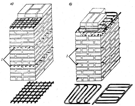 Рис.11.6. Армирование кирпичных столбов и простенков: а - прямоугольными сетками; б - зигзагообразными сетками; 1 - выступающие концы прутков сеток