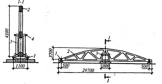Рис.14.4.Стеллаж для укрупнения железобетонной фермы: 1-одиночные кассеты; 2-полуфермы; 3-парные кассеты; 4-горизонтальные винты иногда укрупняют фермы длиной 24 м и более, в том числе с фонарями. Уложенные горизонтально части укрупняемых элементов совмещают на стеллаже сборочными отверстиями и закрепляют болтами или пробками. При отсутствии сборочных отверстий правильность совмещения стыкуемых элементов проверяют с помощью фиксаторов, закрепленных на прогонах стеллажа. Конструкция стеллажа позволяет сначала осуществить сварку верхнего и нижнего поясов сверху, затем во избежание потолочной сварки укрупняемый элемент перекантовывают на другую плоскость и проваривают стыки с другой стороны. Укрупнение элементов в пространственные блоки размером на ячейку обычно осуществляют при значительных объемах работ и выполняют на конвейерных линиях. Эта линия размещается на рельсовых путях, по которым на специальных тележках перемещают укрупняемые блоки. На каждом посту или стоянке конвейера выполняют определенные монтажные или сопутствующие и отделочные процессы. Блоки укрупняют из ферм, объединенных связями и прогонами, сверху устраивают кровлю в виде стального профилированного утепленного настила с покраской металлоконструкций, иногда с устройством мягкой кровли. Каждый пост оснащают необходимыми монтажными механизмами и приспособлениями. Количество стоянок конвейера колеблется от 4 до 16, для удобства работы отделочные посты оборудуют тепляками, что дает возможность выполнять процессы независимо от погодных условий. Временное усиление конструкций. Временное усиление осуществляют для восприятия монтажных усилий. Применяют усиление конструкций, когда расчетная схема конструкции и возникающие при подъеме элемента усилия не совпадают, что может привести к потере устойчивости и прочности конструкции или ее отдельных частей и узлов при подъеме. Потребность в таком усилении в большей степени относится к металлическим фермам, пояса которых, при большой нераскрепленной длине, могут оказаться недостаточно устойчивыми и жесткими при подъеме. В процессе монтажа многие конструкции находятся в условиях, отличающихся от условий их работы при эксплуатации, хотя действующие на них нагрузки обычно меньше эксплуатационных, но приложены они почти всегда в местах, не соответствующих расчетной схеме. Во избежание деформаций конструктивные элементы и блоки конструкций, не обладающие достаточной жесткостью, в процессе транспортирования и подъема усиливают, увеличивая их жесткость, а при необходимости и прочность. Необходимость