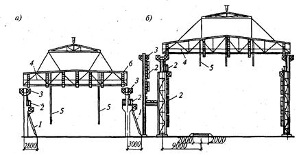 Рис. 14 6. Обустройство конструкций каркаса при монтаже: а - железобетонных; б - стальных; 1 - приставная лестница; 2 - навесная лестница; 3 - навесные подмости; 4 - страховочный канат; 5 - инвентарные распорки; 6 - навесные люльки Применяемые для монтажа конструкций подмости разделяют на сборочные и монтажные. Сборочные подмости служат временными, поддерживающими опорами для конструкций во время монтажа, а монтажные подмости являются рабочими. С них выполняют различные операции: наводку стыков, сварку монтажных соединений, замоноличивание и др. Для работы у высоко расположенных монтажных узлов в покрытиях большепролетных зданий применяют башни - выдвижные или постоянной высоты, передвигаемые по рельсовым путям. На башнях устраивают монтажные площадки для сборки конструкций. Такие башни могут нести функции сборочных и монтажных. Монтажные подмости бывают двух видов: наземные, устанавливаемые непосредственно на земле или иной опоре, используемые при выполнении монтажных работ на сравнительно небольшой высоте; подвесные и навесные, которые крепят к монтируемой конструкции до ее подъема и поднимают вместе с ней, либо навешивают на конструкцию после ее установки. Обычно такие подмости применяют при монтаже на значительной высоте. В качестве наземных подмостей используют переставные подмости и стремянки (рис. 14.7) для работы на высоте до 3,2 м и приставные лестницы с площадками для работы па высоте до 14 м. Применяемые для монтажа конструкций подмости разделяют на сборочные и монтажные. Сборочные подмости служат временными, поддерживающими опорами для конструкций во время монтажа, а монтажные подмости являются рабочими. С них выполняют различные операции: наводку стыков, сварку монтажных соединений, замоноличивание и др. Для работы у высоко расположенных монтажных узлов в покрытиях большепролетных зданий применяют башни - выдвижные или постоянной высоты, передвигаемые по рельсовым путям. На башнях устраивают монтажные площадки для сборки конструкций. Такие башни могут нести функции сборочных и монтажных. Монтажные подмости бывают двух видов: наземные, устанавливаемые непосредственно на земле или иной опоре, используемые при выполнении монтажных работ на сравнительно небольшой высоте; подвесные и навесные, которые крепят к монтируемой конструкции до ее подъема и поднимают вместе с ней, либо навешивают на конструкцию после ее установки. Обычно такие подмости применяют при монтаже на значительной высоте. В качестве наземных подмостей используют переставные подмости и стремянки (рис. 14.7) для работы на высоте до 3,2 м и приставные лестницы с площадками для работы па высоте до 14 м.