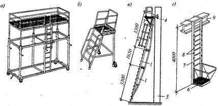 Рис. 14.7. Средства подмащивания: а- передвижные подмости; б - площадка-стремянка; в - приставная лестница с площадкой; г -навесная люлька с лестницей; / - секции лестницы; 2 - ограждение; 3 - навесная площадка; 4 -винтовой зажим; 5 - колонна; б - люлька; 7 - лестница; 8 - отверстия для крепления люльки; 9 –ригель Подвесные лестницы и подмости, закрепляемые на колоннах с помощью хомутов и закладных деталей, располагают в местах примыкания подкрановых балок, стропильных и подстропильных ферм, прогонов и др. Навесные люльки с лестницами навешивают на балки и фермы. Монтажные подмости, лестницы и другие приспособления для безопасной работы на высоте изготовляют из стали и алюминиевых сплавов. Они должны быть легкими, надежными, удобными для установки и снятия после окончания работ. Приставные лестницы с площадками являются основным элементом обустройства колонн для крепления ферм и подкрановых балок к колоннам при небольшой высоте здания (рис. 14.8). Существуют два основных типа монтажных лестниц с площадками: с несущей конструкцией в виде шпренгельной или решетчатой фермы. Первый тип предназначен для выполнения работ на высоте до 7,4 м, второй - до 14 м. Верхнюю часть лестницы крепят к колонне прижимными болтами, нижнюю упирают острыми упорами в землю или закрепляют тягами к колонне. Навесные лестницы разработаны высотой 3,7 и 2,8 м с предохранительной корзиной и без нее; их навешивают на хомуты, специально закрепленные на колоннах на земле, или закладные детали колонн. Хомуты бывают двух видов - нормальные для крепления к колоннам у подкрановой консоли и облегченные для навески на колонны у мест закрепления ферм или балок покрытия. Основной способ навески - за верхние крючья лестниц. Хомуты можно навешивать на колонны различной ширины; недостаток конструкции хомутов –в сложности их снятия после окончания монтажных работ.