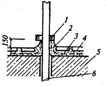 Когда изолируемые поверхности подвергаются непродолжительным периодическим увлажнениям (санитарные узлы, ванные, кухни, подсобные помещения столовых), места прохода трубопроводов при устройстве штукатурной изоляции армируют стеклотканью с выводом ее и закреплением на высоте не менее 120 мм от уровня пола (рис. 19.4). Для большей прочности и получения гладкой поверхности при всех случаях оштукатуривания осуществляют железнение. Технология устройства штукатурной гидроизоляции. Устройство штукатурной изоляции включает в себя операции по подготовке поверхностей, усилению мест возможных деформаций, нанесению штукатурных изоляционных составов, мероприятия по предупреждению сползания гидроизоляционного слоя на вертикальных и наклонных поверхностях. Подготовка поверхностей заключается в очистке, выравнивании и просушивании до требуемой влажности. Места, в которых возможна деформация изолируемых конструкций (сопряжения, утлы, ниши и т.д.), усиливают предварительно установленной металлической сеткой, а также стеклотканью, укладываемой в процессе нанесения штукатурной изоляции. Для повышения надежности сцепления штукатурного слоя с изолируемой поверхностью проводят ее подготовку: срубают наплывы бетона, устраивают насечки, глянцевые поверхности обрабатывают пескоструйным аппаратом, в заключение поверхности обеспыливают, поверхность промывают и сушат. Цементно-песчаную штукатурную изоляцию наносят, как правило, механизированным способом с применением штукатурно-затирочных машин, и только при небольших объемах работ и в неудобных местах — вручную. Широкое применение для механизированного нанесения цементно-песчаных составов получили цемент-пушки, растворонасосы и штукатурные агрегаты. Технология нанесения штукатурных растворов на поверхность будет рассмотрена в отдельной теме. Разновидностью штукатурной изоляции является цементный торкрет, который позволяет механизировать процесс нанесения покрытия и повысить его надежность. Чаще применяют активированный коллоидный цементный раствор, который наносят при помощи цемент-пушки, поддерживая давление сжатого воздуха в пределах 0,25...0,3 МПа. Сухая смесь подается к изолируемой поверхности пневматически по резинотка- Сопло перемещают на расстоянии 50 см от поверхности круговыми движениями, чем достигается более ровное нанесение штукатурного намета. Затирать свеженанесенный слой активированного торкрета не рекомендуется, так как это приводит к нарушению плотности структуры и сцепления с основанием. Гладкую поверхность штукатурной изоляции получают путем нанесения дополнительного слоя толщиной 4...5 мм из состава, содержащего мелкий кварцевый песок. В этом случае верхний слой заглаживают до его схватывания. Вертикальные поверхности изолируют снизу вверх полосами шириной 80... 100 см на всю высоту, длина захватки в пределах 20 м. Нашла применение технология нанесения слоев торкрета с их армированием рубленым стекловолокном. После нанесения слоя раствора производят набрызг под давлением волокон стекловолокна в свежеуложенный слой раствора. Рабочие характеристики покрытия возрастают при добавлении в состав 10% латекса. Общая толщина покрытия достигает 8... 10 мм и характеризуется высокими трещиностойкостью и прочностью. После нанесения штукатурной изоляции из
