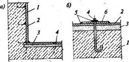 как при возникновении малейших протеканий они могут быть выявлены и устранены без особых усилий и затрат, связанных с устройством специальных шурфов или колодцев вокруг подземного сооружения. Металлическую изоляцию в основании сооружений выполняют по асфальтовой подготовке. Наружная поверхность металлических листов должна быть защищена от коррозии лакокрасочными покрытиями или штукатуркой по сетке. Листы соединяют на сварке внахлестку или встык двумя лобовыми швами, которые обеспечивают соединение, равнопрочное основному металлу, и с помощью закладных деталей и анкеров крепят к изолируемой поверхности (рис. 19.9). Для предохранения от коррозии открытую поверхность грунтуют и окрашивают за два раза антикоррозийными красками или оштукатуривают цементным раствором по металлической сетке. В пространство между конструкцией и металлической изоляцией под давлением нагнетают цементный раствор для большей герметизации между ними.