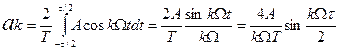 t/2 bk = 2/Т ò A sin kWt dt = 0, т.к. подинтегральная функция - нечетная. -t/2 Пусть Т = 2t, тогда коэффициенты ak равны: a0 = А, ak = 2А/ kp (sin kp/2), при к > 0. Итак, временная диаграмма периодической последовательности импульсов показана на рис.2.1. Спектр этой последовательности показан на рис.2.2.