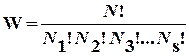 5.5.3.1. В равновесии термодинамические параметры системы постоянны, но микрохарактеристики молекул претерпевают непрерывные изменения. Таким образом, макросостояния системы реализуется множеством микросостояний. Число микросостояний, совместимых с данным макросостоянием, называется термодинамической вероятностью 5.5.3.2. Принципы расчета термодинамической вероятности. 5.5.3.2.1. Микросостояния отличаются друг от друга перестановкой частиц. 5.5.3.2.2. Перестановки внутри одной ячейки не ведут к новому микросостоянию, так как состояния внутри ячейки неразличимы. 5.5.3.2.3. В одно макросостояние входят все микросостояния с одинаковым количественным распределением частиц по ячейкам, т.е. задать макросостояние на микроуровне можно определением числа частиц в каждой ячейке фазового пространства Ni. 5.5.3.2.4. Основной постулат – для изолированной системы (U= const): все S N микросостояний имеют одинаковую вероятность, т.е. функция распределения r = const. Это позволяет легко рассчитывать термодинамическую вероятность состояния системы, состоящей из N частиц, распределенных по s ячейкам фазового пространства, используя формулу комбинаторики для числа перестановок: