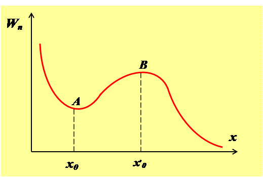 В общем случае потенциальная кривая может иметь довольно сложный вид, например с несколькими чередующимися максимумами и минимумами. В точке А – с координатой х0 -минмум, т.к. Fx= - в минимуме Локомотив массы m начинает двигаться со станции так, что его скорость меняется по закону