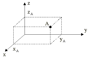 В реальном трехмерном мире система отсчета - это набор масштабных стержней (или линеек) и часы, расположенные в разных местах этих линеек. В модельном мире система отсчета превращается в трехмерную систему координат, положение которой связано с положением тела отсчета. В каждой точке пространства существует возможность определить время любого происшедшего в этой точке события. Первый способ задать положение материальной точки - это задать ее координаты. Например, три числа xА, yА, zА задают положение точки A в декартовой системе координат.