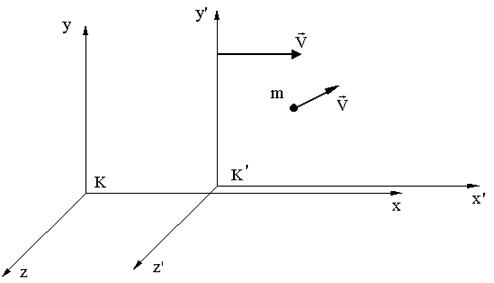 Пусть материальная точка движется в системе К со скоростью . Система K' движется со скоростью относительно K.