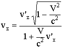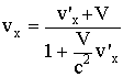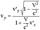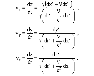Это формулы релятивистского преобразования скоростей, они дают связь между компонентами скорости частицы в различных системах отсчета: в системе K и в движущейся со скоростью V системе K'.