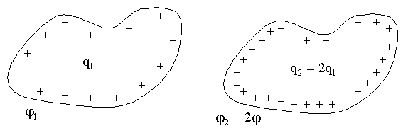 Заряд q2= 2q1 создаёт на том же проводнике потенциал φ2= 2φ1.