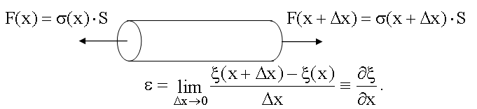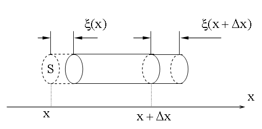 15.3.2. Вывод волнового уравнения из Пусть волна распространяется вдоль упругого стержня. Рассмотрим элемент этого стержня, его длина равна Δx в невозмущенном состоянии. Пусть при распространения волны левая часть этого элемента сместится на величину ξ(x), а правая - на величину ξ(x + Δx), не равную смещению левой части.