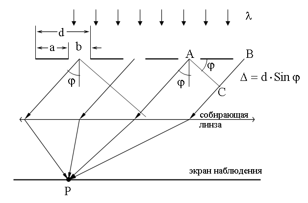 Разность хода лучей, идущих от соответственных точек соседних щелей найдем из треугольника ABC: