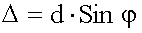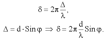 Здесь δ - разность фаз колебаний, идущих в точку P от соответственных точек соседних щелей. Выразим δ через Δ (18.1.2.2), а Δ из треугольника ABC: