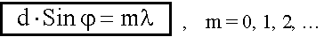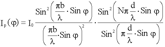 Здесь I0 - интенсивность, создаваемая одной щелью при φ = 0, первая дробь учитывает зависимость от интенсивности от φ одной щели, а вторая учитывает результат многолучевой интерференции N щелей. При выполнении условия главного максимума d·Sinφ = mλ вторая дробь после раскрытия неопределенности по правилу Лопиталя дает N2. Таким образом, интенсивность в максимуме, как и было показано в (19.4.1), в N2 раз больше интенсивности, создаваемой одной щелью.